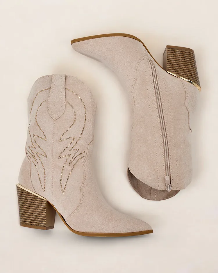 - Zābaki, kas līdzīgi kaubojiņu stilam ar papēžiem, izgatavoti no ekoloģiskā zamšādas. Eco ādas iekšzole, kurpes aiztaisāmas ar rāvējzīmi, rotātas ar cirkoniem. Tie labi iederēsies daudzās sievietes stilos!