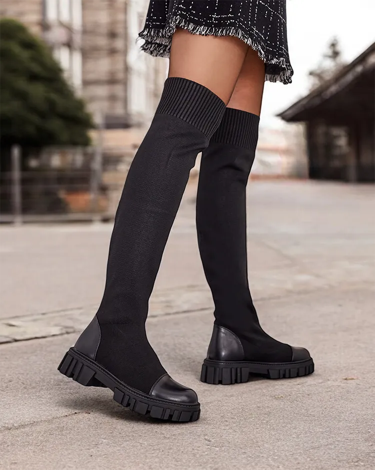 - Stils sieviešu pāri ceļgalu zāģu uz biezāka zoles. Augšējā daļa izgatavota no elastīga auduma materiāla ar uzstādījumiem no ekovakara, ar auduma iekšzoli iekšā. Uzvilciet modeli. Ideāla ikdienas rudens tērpu komplektiem!