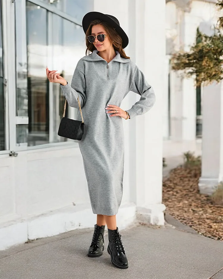 • Sieviešu midi džemperkleita ar garām piedurknēm. Modelis ir izgatavots no adījuma. Ar rāvējciepu izgriezumu. Obligāta izvēle šajā sezonā! PIEZĪME: mērījumu precizitāte (+/-) 1 cm. Mērījumi veikti plakani.
