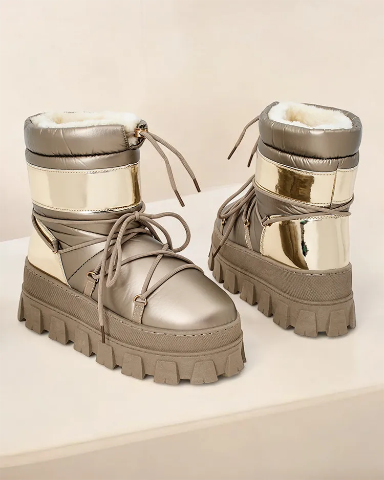 - Sieviešu sniega zābaki ar kāju daļu, kas izgatavota no auduma kombinācijas, kas atgādina parafīnu, un matētas ekoloģiskās ādas. Iekšpusē ir patīkama mākslīgās kažokādas apdare, kurus var uzvilkt, un piespraudiet. Ideāli ziemai!