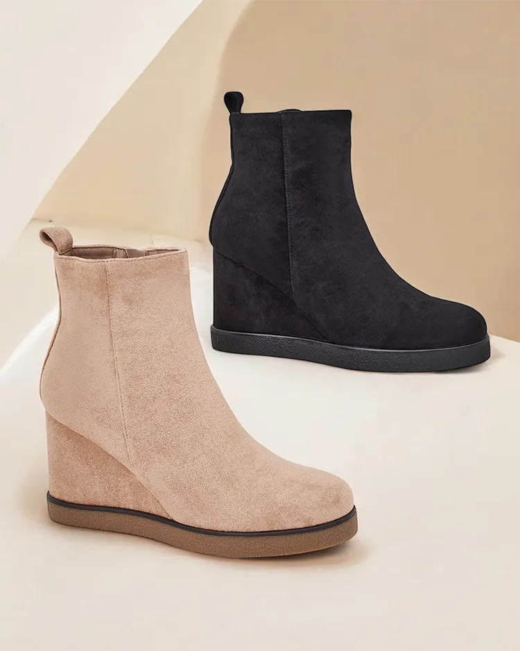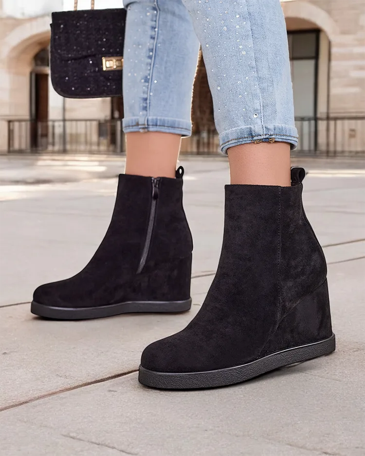 • Eleganti sieviešu klinšu zābaki, izgatavoti no ekoloģiskā audekla. Kurpes iekšpusē aploksnētas ar kažokādu. Ideāla izvēle rudenim!