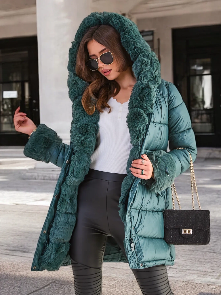 - Sieviešu piedurkne ar kapuci un noņemamu kažokādas apdari ziemas jaku. Modele piestiprināts ar rāvējizlietni un pogām, ir 2 kabatas un siksniņas, lai uzsvērtu vidukli. Ideāli piemērots vēsākiem laikapstākļiem!