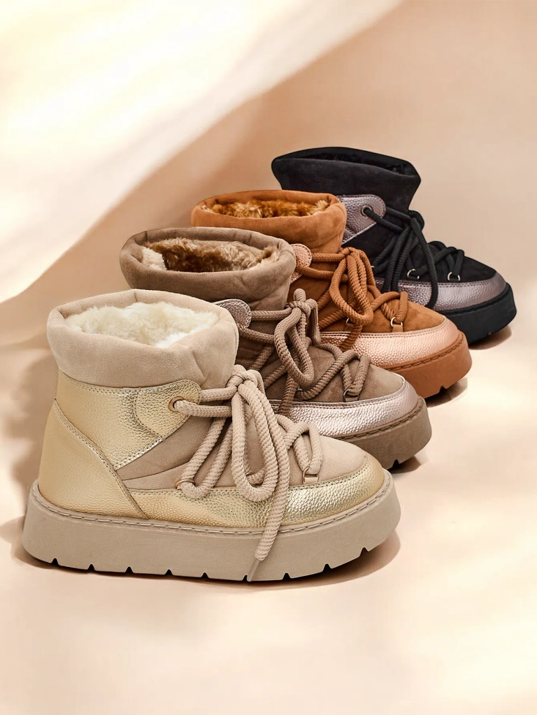 • Sieviešu sniega apavi ar kāju, izgatavoti no ekoloģiskās ādas un ekoloģiskās sudraba apvienojuma. Iekšpusē ir patīkama kažokāda, slip-on un mežģīšu apavas. Ideāli piemēroti ziemai!