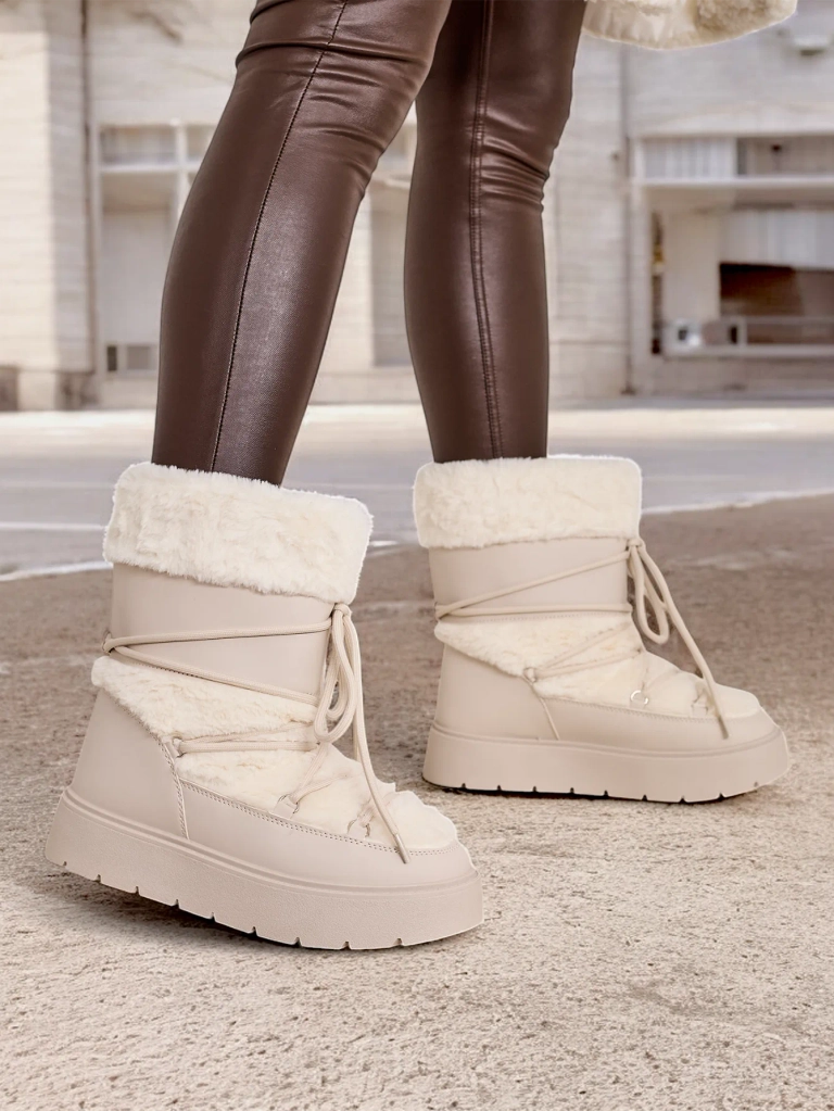 - Sieviešu sniega zābaki ar kātiņu no ekoloģiskās ādas un patīkama auduma kombinācijas. Iekšpusē ir patīkama kažoka apdare, un zābakiem ir audžu kāts. Ideāli piemēroti ziema!
