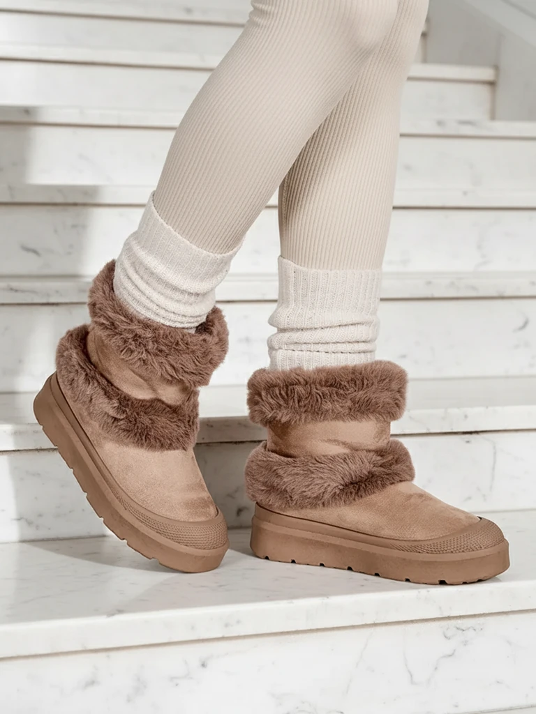 - Sieviešu sniega zābaki ar kājiņu, izgatavotu no kombinācijas no sudraba ekoloģiskā āda un ērtas auduma. Iekšpusē ir jauka mākslīgās kažokādas apdare. Lielisks ziemai!