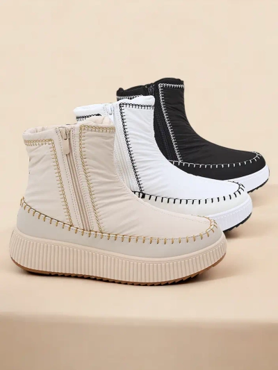 - Sieviešu sniega zābaki ar virspusi, kas izgatavota no brezentam līdzīga materiāla. Iekšpusē ir smalka izolācija, un apavos ir rāvējslēdzēja aizdare. Ideāli piemēroti aukstākajām sezonām!