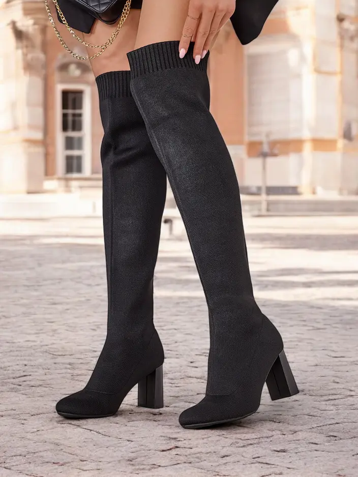 - Stilīgas sieviešu ceļgalu augstās zābaki uz blokveida papēža. Apavi ir pilnībā izgatavoti no patīkama auduma. Ieliekamais modelis. Ideāli iederas ikdienas rudens apģērbā!