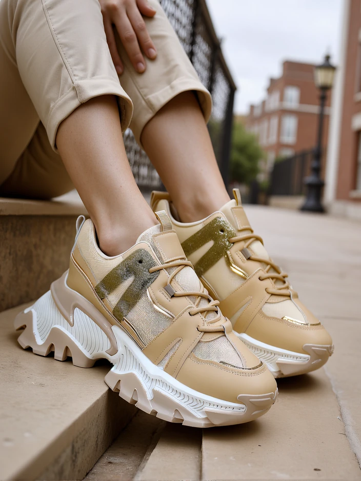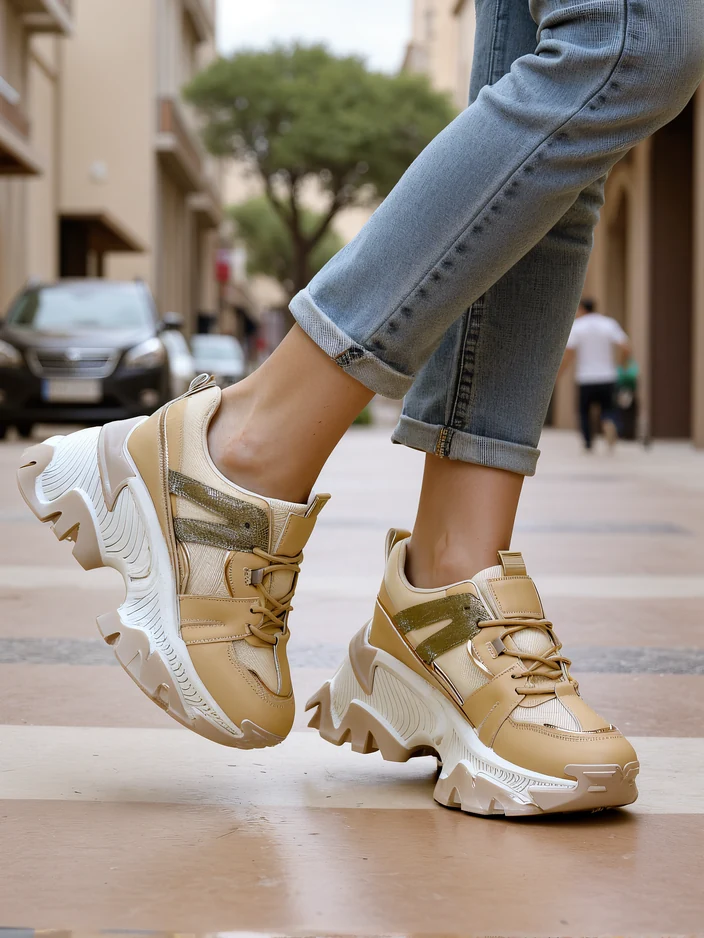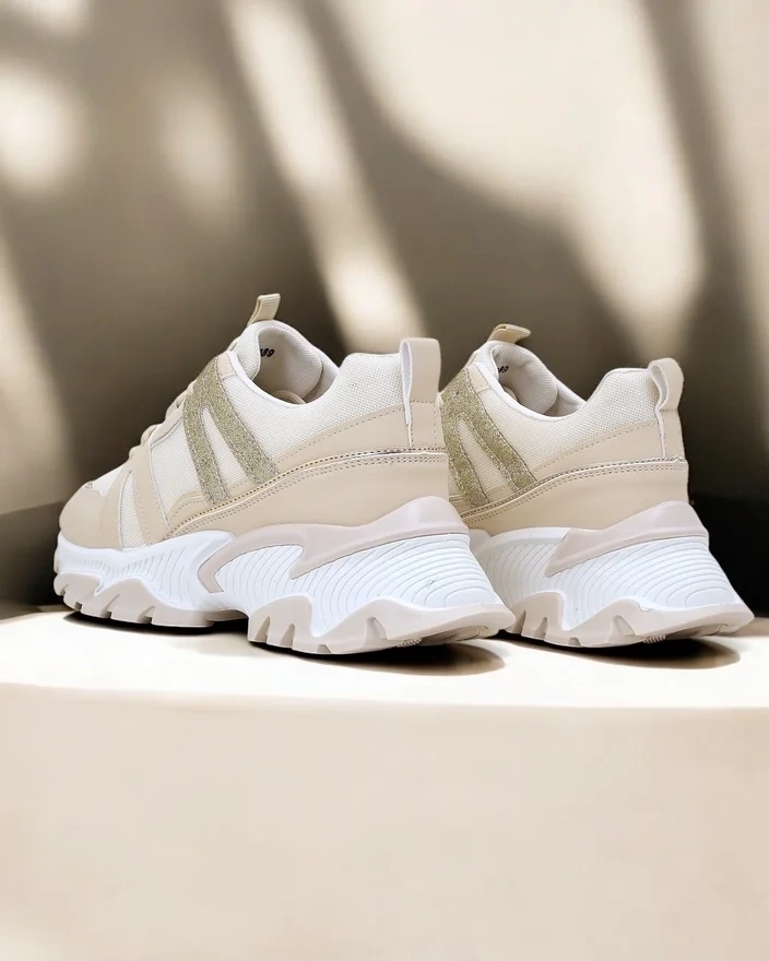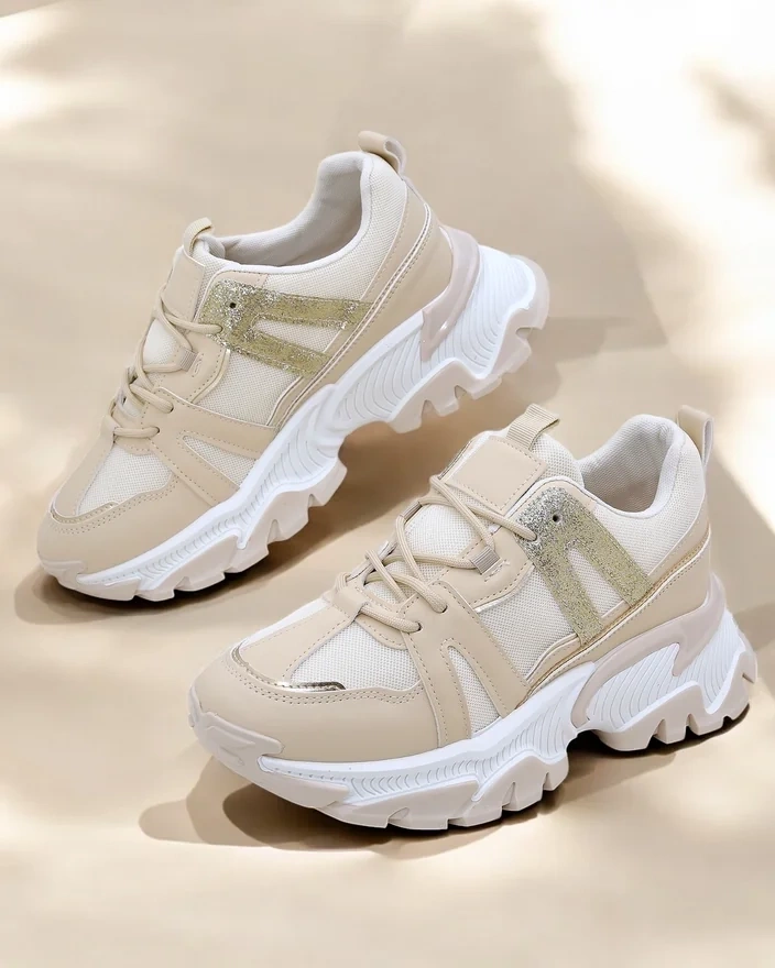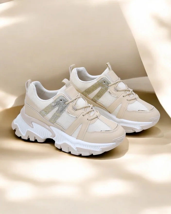 • Sieviešu platformas sneakeri. Apavi izgatavoti no eko-āda ar mirdzošām ieliktņām un auduma iekšzoli. Lielisks papildinājums jūsu ikdienas apģērbam!
