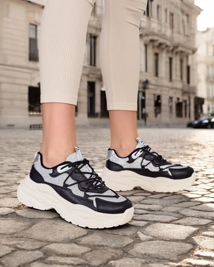 • Sieviešu sporta apavi čības stilā ar biezāku zoli. Izgatavoti no eko-ādas ar spīguļiem. Auduma zole. Lielisks papildinājums jūsu ikdienas ikdienas apģērbiem!