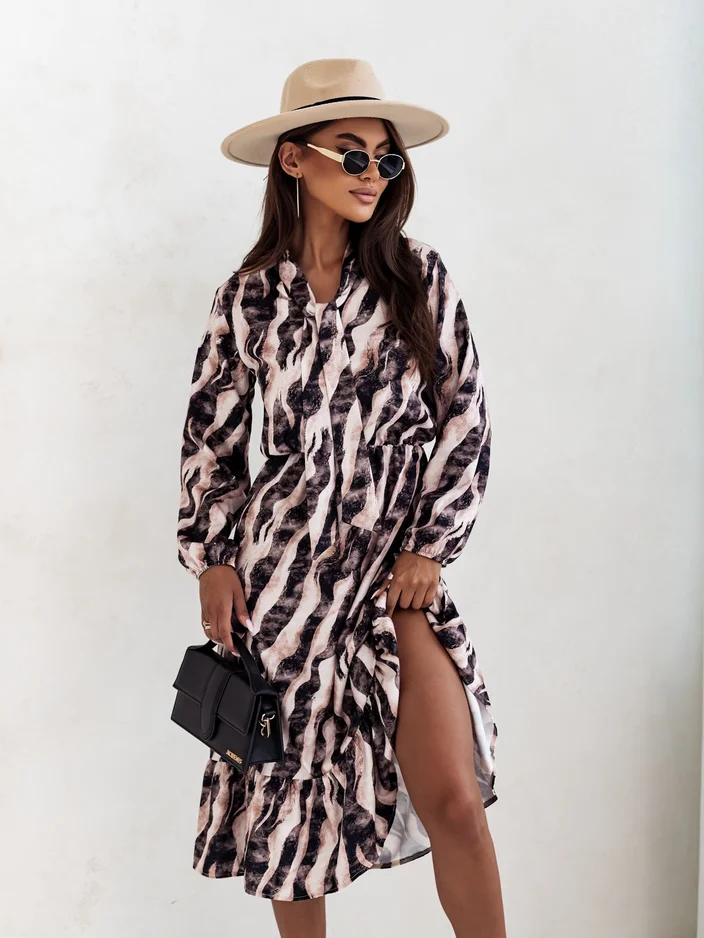 - Sieviešu midi kleita ar druku, garām piedurknēm un aukliņas apkakli. Modelis ir ar elastīgu vidukli un plūstošu griezumu. Ideāli piemērots ikdienas nēsāšanai! PIEZĪME: Mērījumu precizitāte (+/-) 1 cm.
