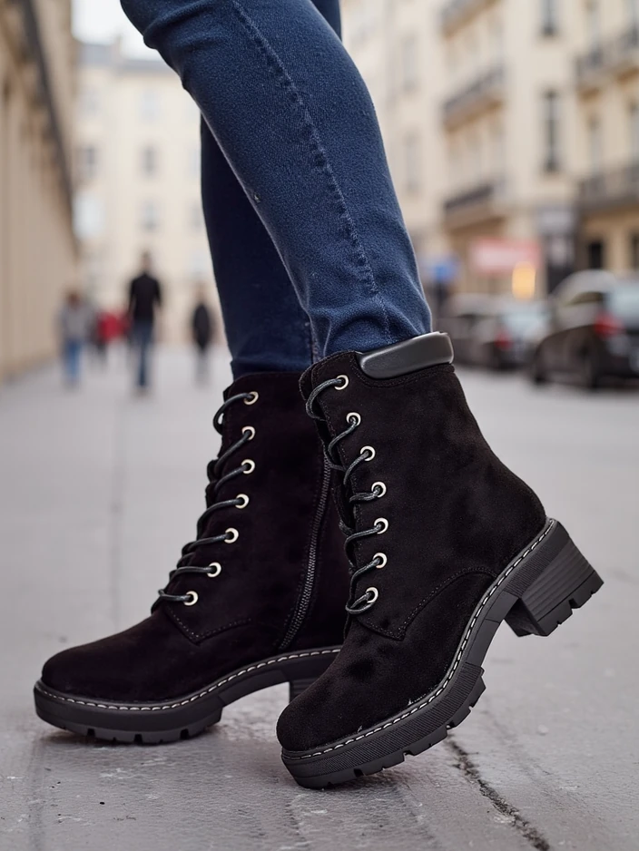 - Unikāli ankle zābaki, kas izgatavoti no zamšādas ekokoženes ar auduma zoli. Mežģīņu zābaki ar rāvējslēdzēju. Modelis uz blokpēdas. Ideāli rudenim!
