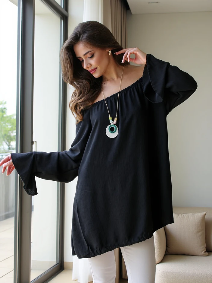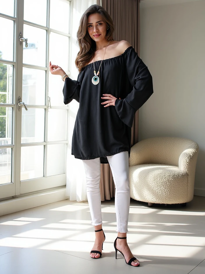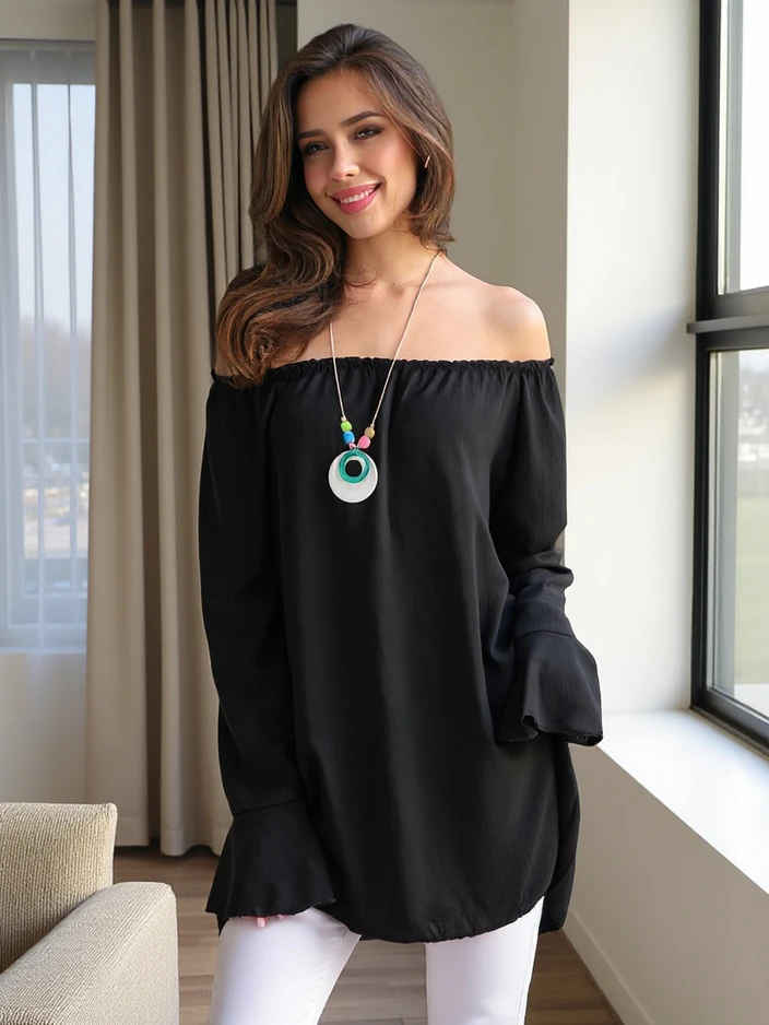 - Izcila sieviešu blūze spāņu stilā, izgatavota no mīksta, patīkama materiāla. Tā ir ar apaļu kakla izgriezumu ar elastīgu elementu un piedurknēm, kas rotātas ar volāniem. Kompletā iekļauta arī kaklarota. Ideāli piemērota ikdienas valkāšanai, kā arī īpašām