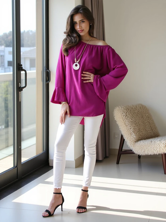 - Izcila sieviešu blūze spāņu stilā, izgatavota no mīksta, patīkama materiāla. Tā ir ar apaļu kakla izgriezumu ar elastīgu elementu un piedurknēm, kas rotātas ar volāniem. Kompletā iekļauta arī kaklarota. Ideāli piemērota ikdienas valkāšanai, kā arī īpašām