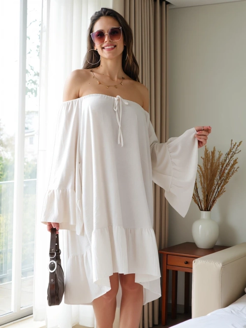 - Apburoša a'la spāņu kleita, izgatavota no viegla, gaisīga auduma. Ceļa garuma modelis ar garām piedurknēm, rotāts ar volāniem un elastīgu apkakli, kas izceļ siluetu. Pilna šarma un viegluma!