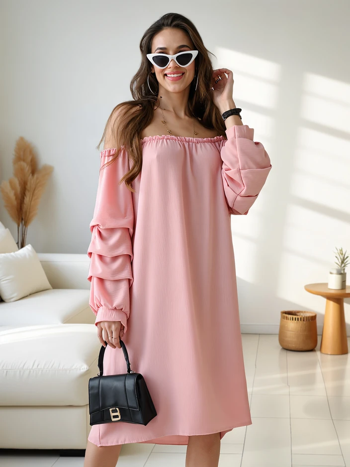 - Burvīga kleita a la spāņu, izgatavota no viegla, plūstoša auduma. Ceļgalu garuma modelis ar garām piedurknēm, rotātām ar volāniem un elastīgu apkakli, uzsverot siluetu. Pilna šarma un viegluma!