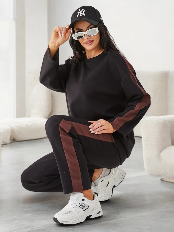 - Sieviešu treniņtērpa komplekts, izgatavots no patīkama auduma. Miki krekls ir uzvelkams pāri galvai, tam ir garas piedurknes un apaļa kakla izgriezums. Taisnas bikses ar 2 kabatām un elastīgu jostu. Ideāli piemērots tiem, kuri novērtē komfortu.