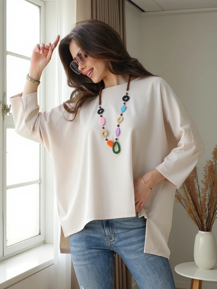 - Oriģinālā sieviešu blūze ar apaļu kakla izgriezumu, izgatavota no patīkama un mīksta auduma. Šim produktam ir brīvs piegriezums un tam ir 3/4 garuma piedurknes. Papildus komplektā iekļauta kaklarota. Ideāla izvēle stilīgu apģērbu veidošanai!