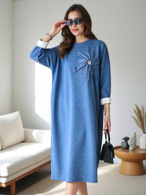 - Brīva stila sieviešu midi kleita ar garām piedurknēm un apļveida dekoltē. Papildus ir dekoratīvā puķe. Šīs sezonas obligāta lieta! PIEZĪME: Mērījumu precizitāte (+/-) 1 cm. Izmēri mērīti līdzenā virsmā.