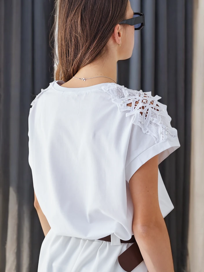 Royalfashion Sieviešu kokvilnas T-krekls ar mežģīņu piedurknēm