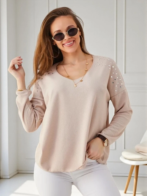 • Sieviešu džemperis ar V veida kakla izgriezumu, izgatavots no patīkama auduma. Modelim ir garas piedurknes. Tas ir dekorēts ar rhinestones uz pleciem. Ideāla bāze ziemas apģērbiem!