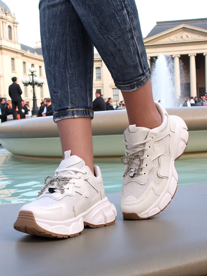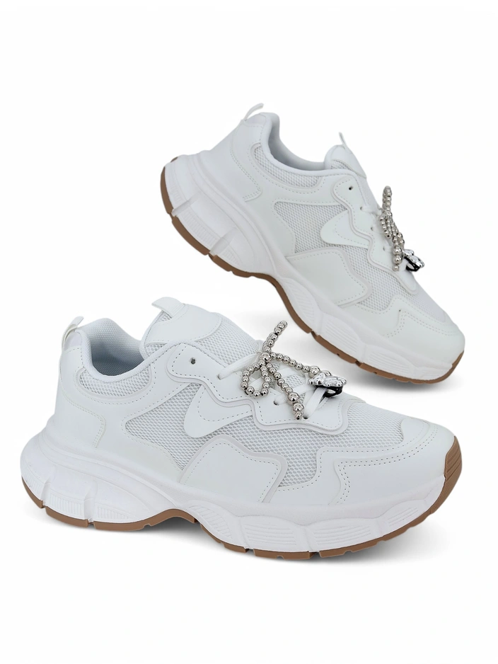 • Sieviešu sporta apavi, kas izgatavoti no ekoloģiskās ādas un režģa. Modelis ar biezāku zoli. Apsietā virsma. Tie lieliski derēs ikdienas apģērbiem! Dekorēti ar noņemamu ķēdi.