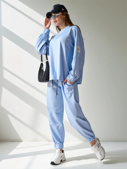 - Sieviešu ikdienas komplekts, kas izgatavots no patīkamas auduma. Puloveram ir garas piedurknes. Biksēm ir 2 slīdošas kabatas, elastīgs jostasvietā un potītēs. Ideāli piemērots tiem, kuri vērtē komfortu.