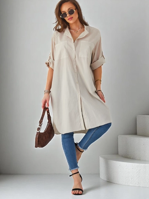 - Klasisks garais sieviešu oversize krekls, izgatavots no patīkama auduma. Tam ir V-veida kakla izgriezums un garas piedurknes. Vienkāršais griezums nodrošina perfekti piemērotu uz katras figūras! PIEZĪME: Mērījumu precizitāte (+/-) 1 cm.
