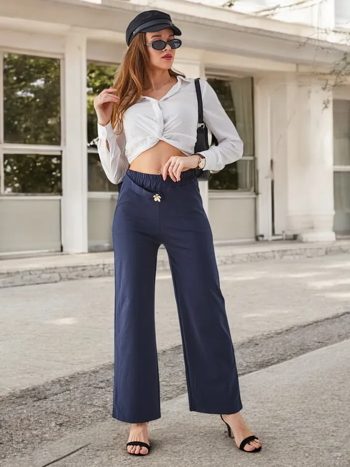 Royalfashion Kokvilnas plata sieviešu bikses ar jostas līdzīgu rotājumu