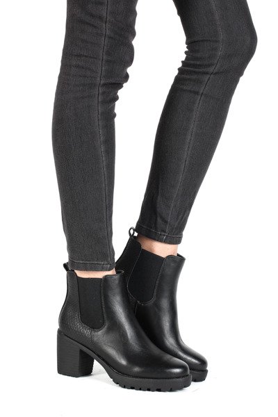 - Klasyczne, wsuwane botki na gumowym słupku. Całość wykonana z ekologicznej skóry, lecz tył posiada oryginalnie fakturowanie imitujące łuskę.