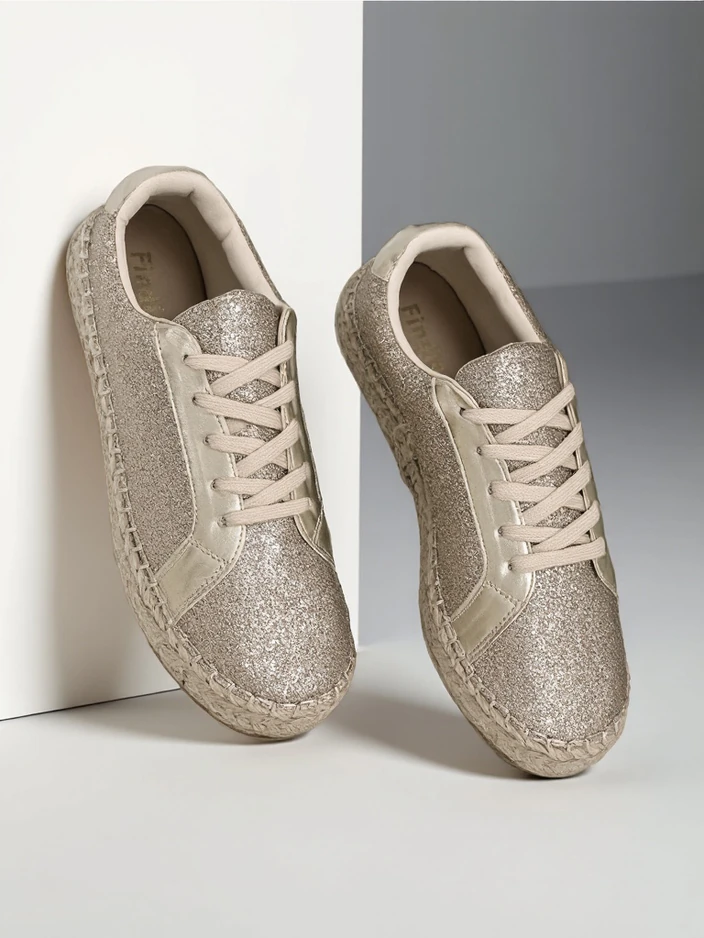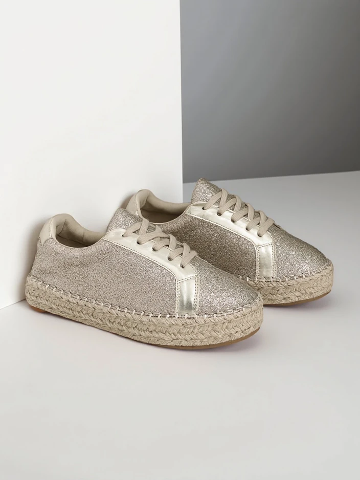 - Sieviešu sporta apavi izgatavoti no auduma materiāla ar spīdumu. Vīlētu augšdaļu. Klasiska gumijas zole, ietīta jutu virvē. Šie apavi būs lieliski ikdienas valkāšanai!
