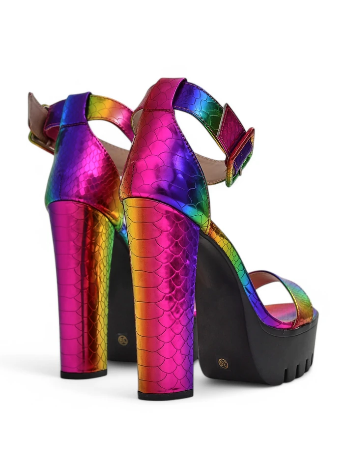 - Elegantas sieviešu bloku papēža sandaļi, kas izgatavoti no patentētas hologrāfiskas eko-ādām ar reljefu. Produkts ir piestiprināts ar sprādzi pie potītes augstuma un tam ir eko-ādas zolīte. Unikāla un izteiksmīga izvēle!
