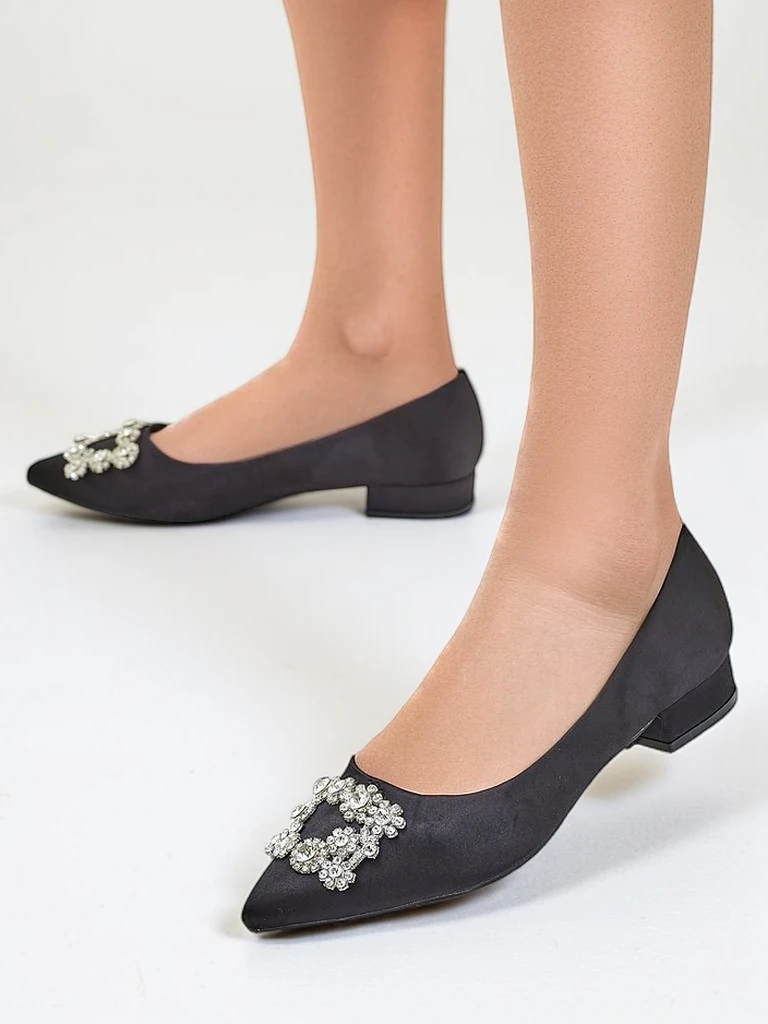 - Unikālas balerīnas, kas izgatavotas no satīna līdzīga auduma ar smailo purngalu. Augšdaļa ir rotāta ar smalku aizdari ar rhinestones. Mīkstā ekoloģiskā ādas zole nodrošina komfortu. Tās būs ideālas elegantiem un modes apģērbiem!