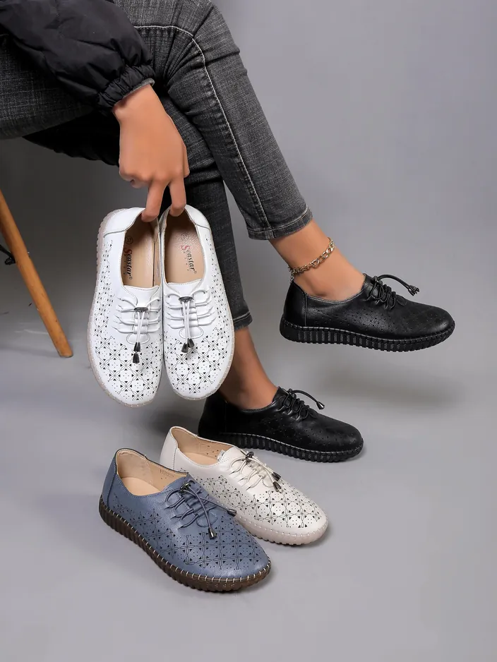 - Sieviešu caurumiņotās kurpes uz biezākas zoles. Slip-on augšdaļa ir izgatavota no ekoloģiskās ādas, zole ir izgatavota no ekoloģiskās ādas. Ideāla bāze ikdienas apģērbam!