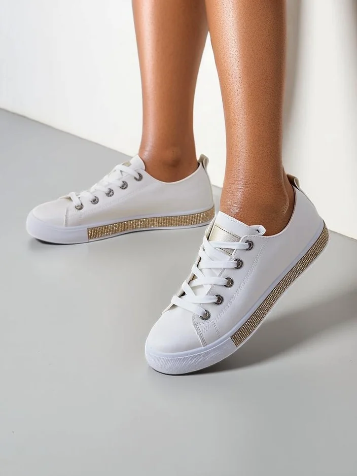- Klasiski sneakeri no ekokroka, iekša ir pārklāta ar audumu. Ļoti ērti pateicoties gumijas zolei ar rhinestones dažādās krāsās. Apavi piemēroti daudzām ikdienas stiliem!