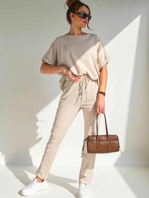 - Sieviešu ikdienas komplekts, kas izgatavots no patīkama auduma. Augšdaļa ir pull-over stila ar īsām piedurknēm un apaļu kakla izgriezumu. Taisnas bikses ar elastīgu jostasvietu. Ideāli tiem, kuri novērtē komfortu.