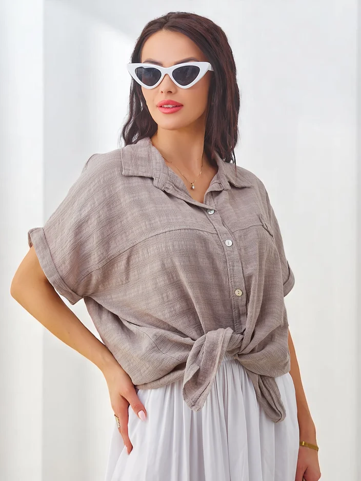 - kokvilnas sieviešu krekls ar reljefu un īsām piedurknēm. Modelis ar V-veida izgriezumu, pogājams dizains. Nepieciešamība katras sievietes garderobē!