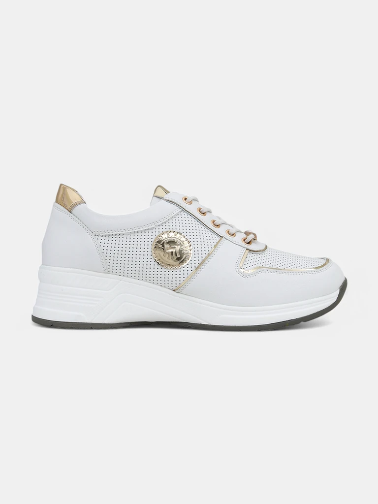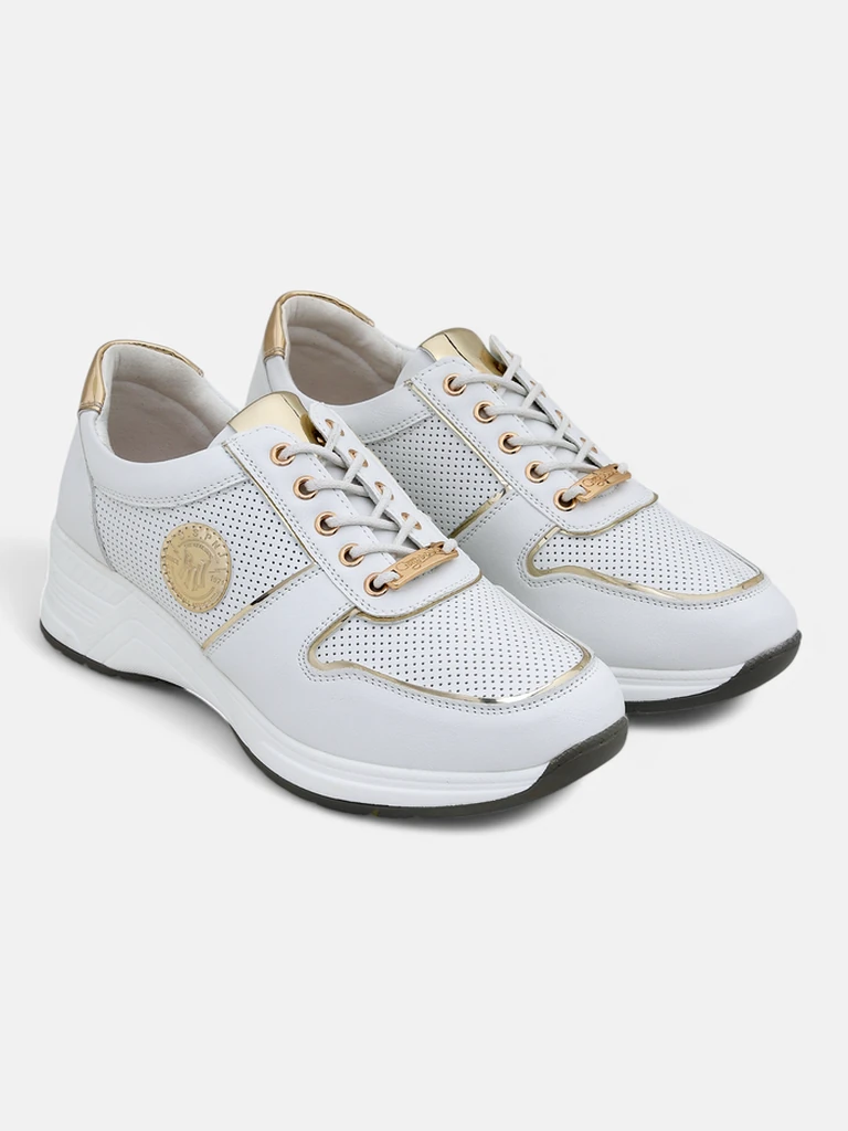 Sneakersy damskie Calista Athena to wyjątkowe buty, które połączą wygodę sportowego obuwia z nutą wysmuklającej i eleganckiej koturny o wysokości 4 cm. Cholewka została wykonana z wysokiej jakości skóry ekologicznej, która została dodatkowo perforowana dla lepszej wentylacji oraz ozdobiona złotymi akcentami, gwarantując trwałość oraz luksusowy wygląd. Wnętrze wyściełane jest naturalną, miękką skórą, co zapewnia stopom najwyższy komfort oraz zapobiega obtarciom, nawet przy wielogodzinnym noszeniu.Buty są niezwykle lekkie, stabilne i zaprojektowane zgodnie z nowoczesnymi trendami – harmonijnie łączą casualowy szyk ze sportowym charakterem. Idealne na wiosnę, lato i jesień, dzięki perforacjom stopa oddycha nawet w cieplejsze dni, a koturn subtelnie wydłuża sylwetkę.- Skóra ekologiczna z wykończeniem premium – materiał wytrzymały i bezpieczny dla środowiska.- Naturalna wkładka minimalizuje zmęczenie stóp oraz gwarantuje oddychalność.- Złote detale dodają oryginalności i elegancji każdej stylizacji.- Stabilny koturn i antypoślizgowa podeszwa zapewniają komfort nawet podczas całodziennego użytkowania.1. Na co dzień – połącz sneakersy z jasnymi jeansami slim i oversizową ramoneską.2. Look casual chic – zadbaj o wygodę na weekend, łącząc je z plisowaną spódnicą midi i basicowym T-shirtem.3. Na spotkanie lub do pracy – postaw na beżowe, materiałowe cygaretki oraz elegancką marynarkę.Sneakersy Calista Athena doskonale łączą się także z letnimi sukienkami czy sportową bluzą, wpisując się w aktualne trendy athleisure i casual elegance.Aby zachować perfekcyjny wygląd butów, przecieraj je miękką, wilgotną ściereczką oraz unikaj moczenia – regularnie czyść suchym szczotką do eko-skóry. Wnętrze z naturalnej skóry można odświeżać delikatnymi sprayami do pielęgnacji. Przechowuj obuwie w suchym miejscu, unikaj bezpośredniego nasłonecznienia i źródeł ciepła. Białe sneakersy na koturnie z metalicznymi złotymi akcentami to obecnie jeden z największych hitów modowych. Kobiety cenią je za komfort, uniwersalność i stylową, sportową elegancję.