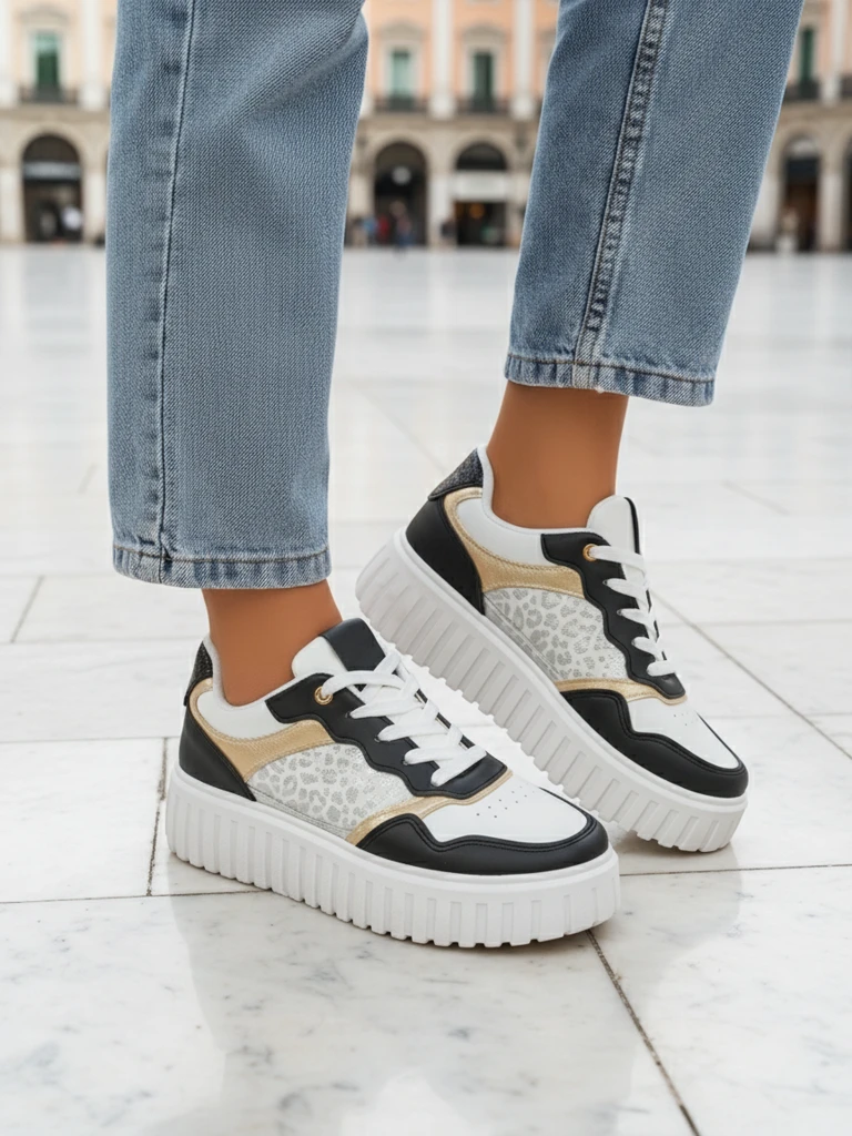 Royalfashion Callista damsneakers i storlek 40 är ett utmärkt val för kvinnor som värdesätter modern design och komfort. Skorna är tillverkade av högkvalitativt ekologiskt läder, som kännetecknas av hållbarhet, nötningsbeständighet och enkel skötsel. Den kontrasterande kombinationen av svart, vitt och guldaccenter i kombination med ett modernt djurmotiv på sidopanelerna ger skorna en energisk och distinkt karaktär, perfekt för urbana stilar.Tillverkningstekniken garanterar komfort vid varje steg – den tjocka 5-centimetersplattformen höjer inte bara figuren, utan dämpar också gången, vilket leder till lätthet och komfort hela dagen. Innersulan i mjukt tyg och den solida snörningen garanterar en korrekt passform till foten. Allt är förpackat i tillverkarens originalkartong, vilket också är perfekt som present.Produktens höjdpunkter och fördelar:- Modernt utseende framhävt av glänsande detaljer som fångar ögat,- Ekologiskt läder som yttermaterial säkerställer hållbarhet och är mer miljövänligt,- Den stabila plattformen gör att du kan bära sneakers i många timmar utan att känna dig trött,- Universalitet – en modell som är perfekt för vår, sommar och höst.Stylingförslag:1. Urban stil: Kombinera sneakers med mom jeans eller byxor med hög midja, en oversized T-shirt och en ramonesjacka.2. Casual elegans: Bär dem med en plisserad midikjol och en lätt tröja – du kommer att lägga till distinktion och lite löshet till stylingen.3. Sportig accent: Kombinera skor med leggings och en bomberjacka eller en hoodie – perfekt för vardagsbruk, shopping eller en promenad.Skötsel och förvaring:- Rengör ytan med en fuktig trasa och undvik att sänka ner den i vatten.- Förvara på en torr, ventilerad plats, helst i originalkartongen.- Undvik att utsätta den för långvarig exponering för solljus, så att läderns färg och struktur förblir som nya.Trender för den aktuella säsongen:Sneakers på en plattform är ett absolut måste de senaste säsongerna, och kombinationen av klassiskt svart med djärva detaljer och djurmotiv åtnjuter fortsatt popularitet på catwalks och i vardagliga stilar. Detta är ett erbjudande för aktiva och självsäkra kvinnor som inte är rädda för att experimentera med mode!
