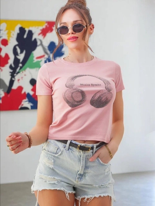 - Sieviešu kokvilnas T-krekls ar druku, kas apvieno komfortu ar maigu spīdumu. Lieliski piemērots ikdienas apģērbam, tas piešķir unikālu šarmu jebkuram izskatam.