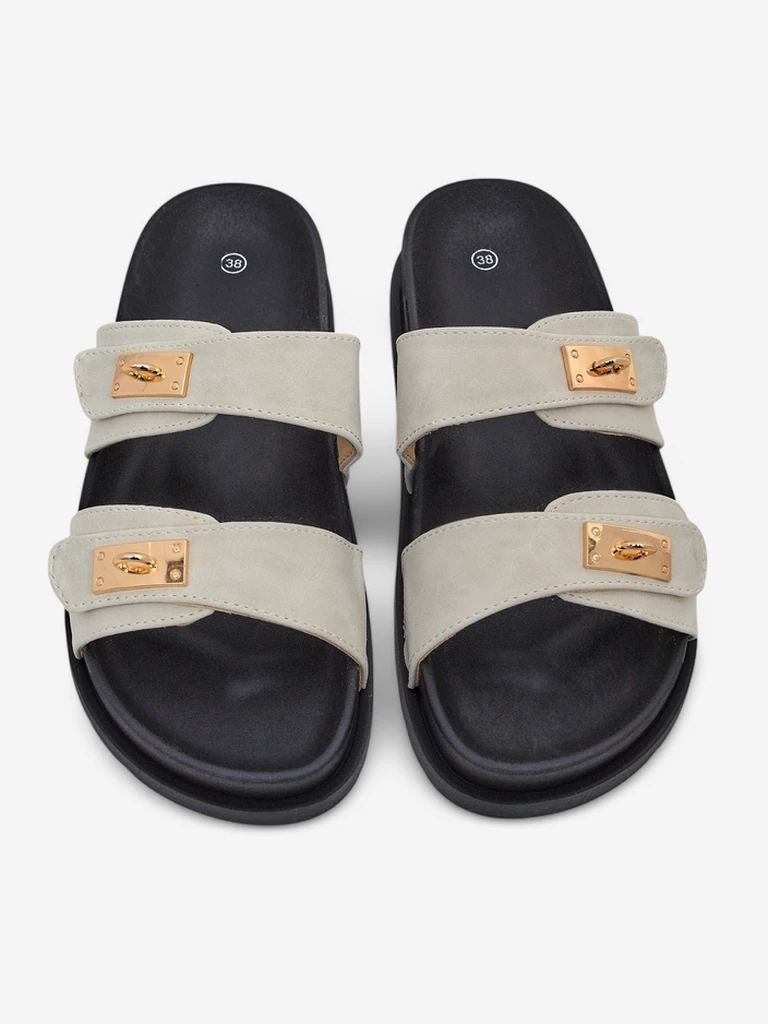 - Čības ar biezākiem zoli ir stila un komforta kombinācija. To matēta ekomateriāla siksna kopā ar sprādzēm piešķir šarmu, akcentējot eleganci. Ekomateriāla iekšzole nodrošina mīkstumu un komfortu katrā solī. Šīs čības ir ideāli piemērotas vasaras dienām!