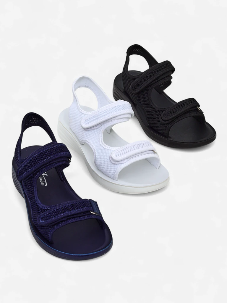 - Športové dámske sandále na plochej podrážke, majú textilné remienky a gumovú vložku. Prezentovaná dámska obuv sa zapína na suchý zips. Dobre priliehajú k nohe!