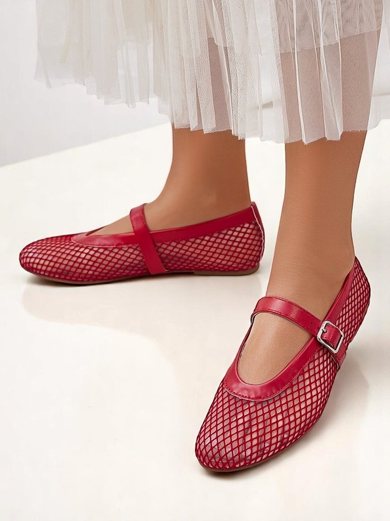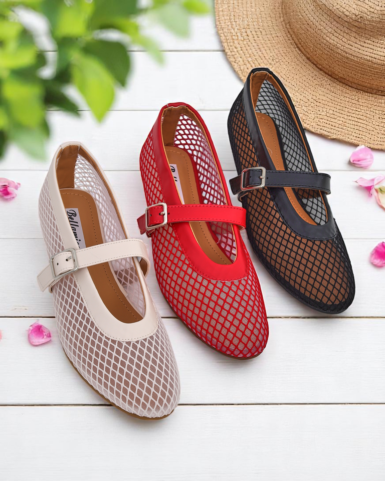 - Izcilas balerīnas, izgatavotas no auduma ar izgriezumiem. Augšdaļa dekorēta ar siksniņām. Mīkstā ekoloģiskās ādas zolīte nodrošina komfortu, un siksniņa tur apavus perfekti uz kājas. Tās ir ideālas modes tērpiem!
