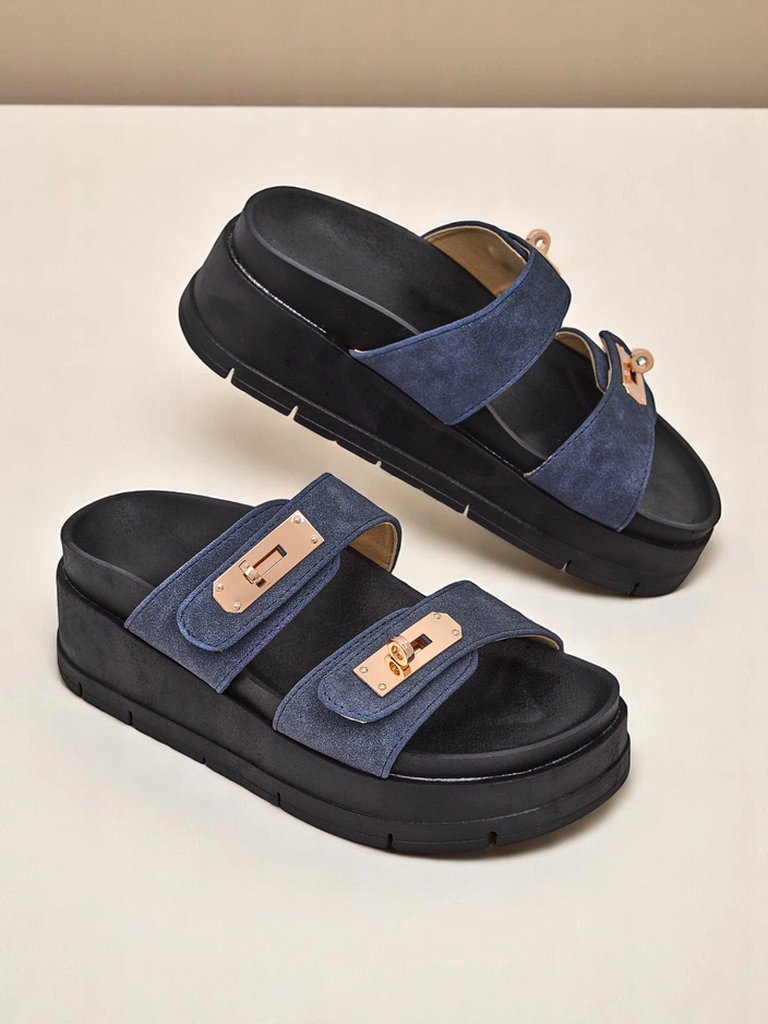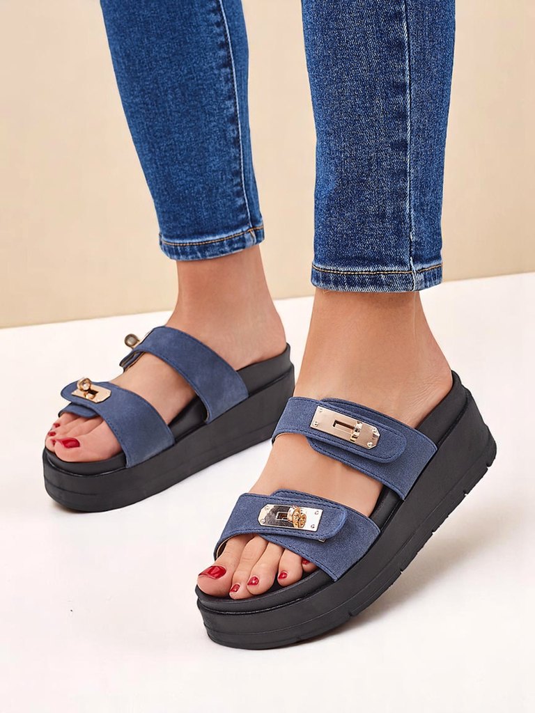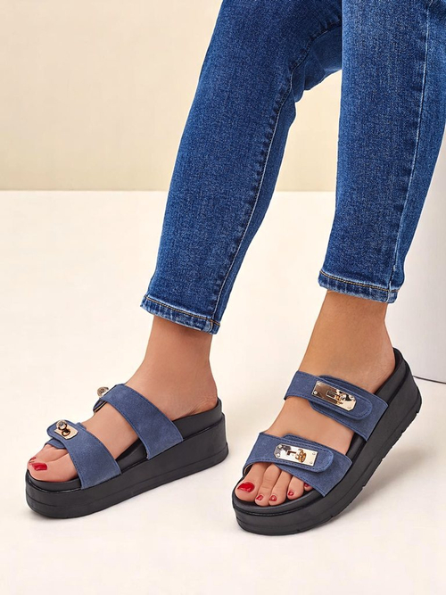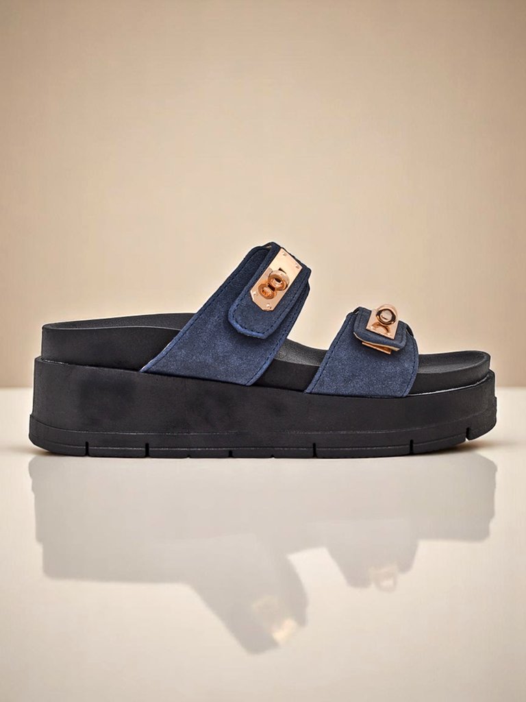 Aura čības ir vasaras stila un komforta iemiesojums. Izgatavotas no augstas kvalitātes zamšādas, tās nodrošina maigumu un komfortu visu dienu. Izturīga, bieza plastmasas zole garantē stabilitāti un amortizē triecienus, rūpējoties par jūsu kāju veselību. Zelta metāla sprādzes piešķir čībām eleganci un šiku, kalpojot kā stilīgs akcents.