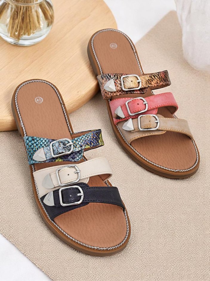 - Plat lav sandale fo eco leathers con embossments e decorative buckles. Stylish, comfortable – perfect fo summer, city e everyday stylizations!