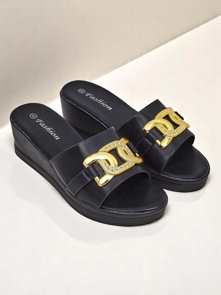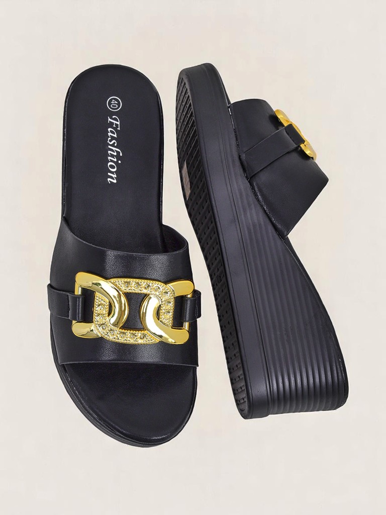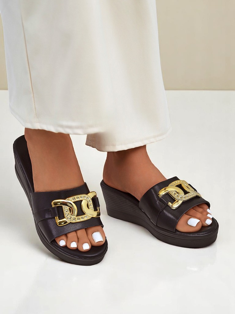 - Nolia ir stilīgas platformenes no eko ādas ar metālisku apdari un smalku zelta dekoru. Ideāli piemērotas vasarai – apvieno eleganci ar ikdienas komfortu.