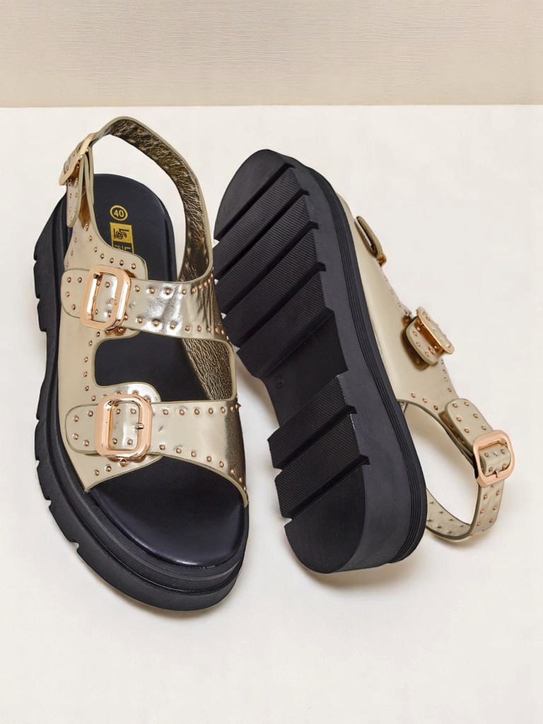 Aurelia Lux ir unikālas sandales ar biezām, profilētām zolēm, kas lieliski atspoguļo modernas elegances garu, iedvesmojoties no klasiskās itāļu estētikas. Virsma ir izgatavota no augstas kvalitātes eko ādas metāliskā, zelta tonī, dekorēta ar sīkiem kniedēm un izturīgām, metāla sprādzēm zelta krāsā, kas piešķir tām unikālu un greznu raksturu. Eko āda ir apstrādāta, izmantojot modernu bezdūmu tehnoloģiju, un materiālam ir OEKO-TEX sertifikāts, kas garantē drošību pat jutīgai ādai.Aurelia Lux sandales ir aprīkotas ar izturīgu, pretslīdes zoli, kas izgatavota no vieglām, elastīgām EVA putām - tā ir komforta garantija ikdienas lietošanā un pēdas amortizācijai. Regulējamās siksnas ļauj ideāli pielāgoties jebkurai pēdai, kas palielina komfortu un viegluma sajūtu katrā solī.Šo sandalu lielākās priekšrocības ir:- stilīga, spīdīga virsma, kas piesaista uzmanību,- komforts, pateicoties zoles ergonomiskajam profilam,- daudzpusība – piemērotas gan ikdienas stilam, gan elegantākiem izgājieniem.Kā valkāt Aurelia Lux?1. Kombinējiet tās ar baltām, lina biksēm un vieglu, oversized kreklu – tas ir ideāls izskats tikšanās reizēm ar draugiem vai pusdienām pilsētā.2. Valkājiet ar maxi kleitu ziedu rakstos vai pasteļtoņos – lieliska iespēja romantiskai pastaigai vai dārza ballītei.3. Savienojiet ar klasiskiem mom fit džinsiem un basic melnu topu – papildiniet stilu ar modernu, metālisku somiņu.Tīrīšana un kopšana: Ieteicams tīrīt ar sausu, mīkstu drānu un izmantot eko ādas kopšanas līdzekļus. Izvairieties no pārmērīga kontakta ar ūdeni un ilgstošas pakļaušanas tiešiem saules stariem. Uzglabājiet sandales sausā, vēdināmā vietā.Aurelia Lux ir atbilde uz jaunākajām modes tendencēm, kur dominē masīvas zoles un izteiksmīgas metāliskas detaļas. Šāda veida sandales parādās lielāko Eiropas pilsētu ielās – tās ir ideāli piemērotas sievietēm, kuras vēlas uzsvērt savu neatkārtojamo stilu un pārliecību par sevi. Aurelia Lux ir šīs sezonas must-have – esi laikā, izvēlies komfortu un greznību!