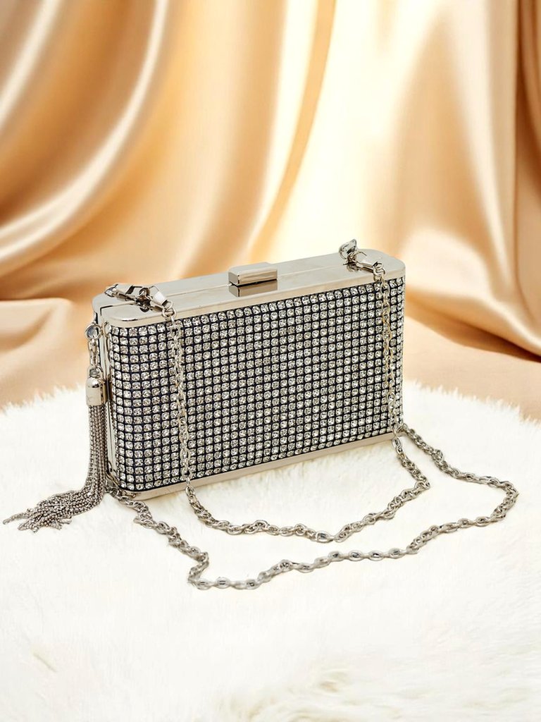 - Vakara somiņa ar rhinestones, aizdarāma ar spiedpogu. Mazs, elegants, ar noņemamām siksnām—var nēsāt gan rokā, gan uz pleca. Pievieno mirdzumu jebkuram tērpam!
