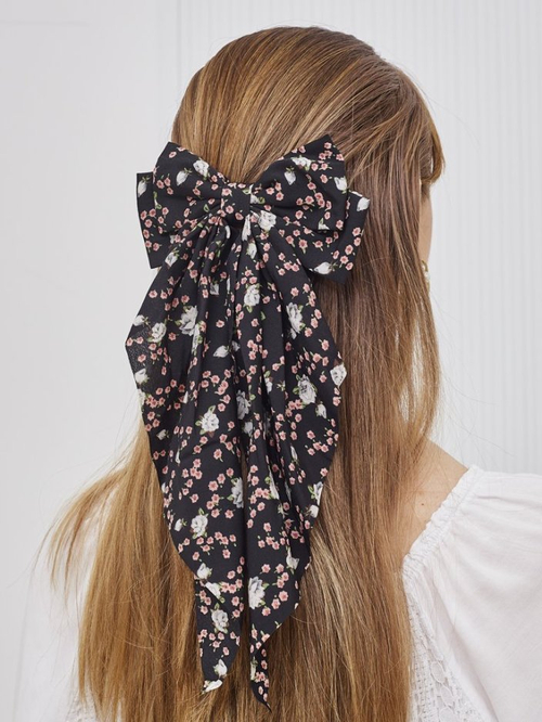 - Matu sprādze ar lenti un garām lentēm ziedu rakstā. Smalks, romantisks aksesuārs, kas skaisti izceļ jūsu frizūru, piešķirot vieglumu un svaigumu jebkuram tēlam.