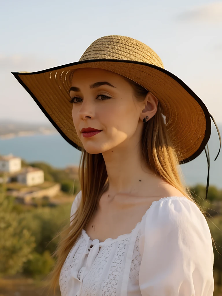 - Vieglā salmu cepure ar platu malu, rotāta ar smalku bantīti. Lieliski piemērota vasarai, pasargā no saules un piešķir stilīgu akcentu jebkuram vasaras tērpam.