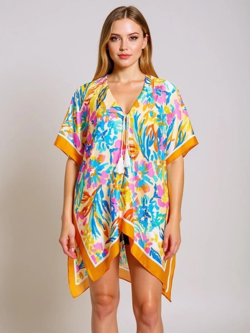 • Letnia tunika plażowa typu pareo z dekoltem w serek i asymetrycznym dołem to stylowy must-have na wakacje. Zwiewna, lekka tkanina i efektowny wzór podkreślają kobiecość, a luźny krój zapewnia komfort w upalne dni. Idealna na plażę i letnie spacery.